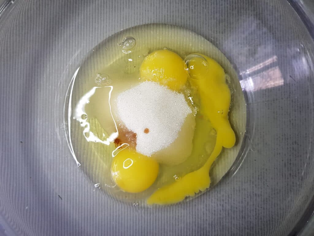 - В глубокую ёмкость разбить яйца, перемешать их вилкой. Добавить сахар, соль и ванилин. Перемешать до растворения сахара.