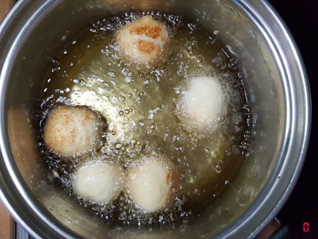 5. Разогреть сотейник с растительным маслом. Обжарить шарики со всех сторон на среднем огне. Сильный огонь лучше не делать, ибо пончики могут быстро обжариться снаружи, при этом внутри останутся сырыми.