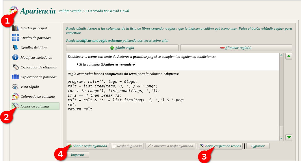 Para eso vemos a (1)Preferencias/Apariencia (2) Iconos en columna y en (3) la carpeta de iconos copiamos las imágenes que deben ser en pgn con el nombre de la categoria ej: Terror.pgn (4) Pegamos la formula que tenemos arriba.