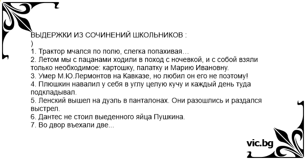 ВЫДЕРЖКИ ИЗ СОЧИНЕНИЙ ШКОЛЬНИКОВ☺Трактор мчался по полю, слегка попахивая… Умер М .Ю .Лермонтов на Кавказе, но любил он его не поэтому!Во двор въехали две лошади . Это были сыновья Тараса Бульбы . Бедная . . .