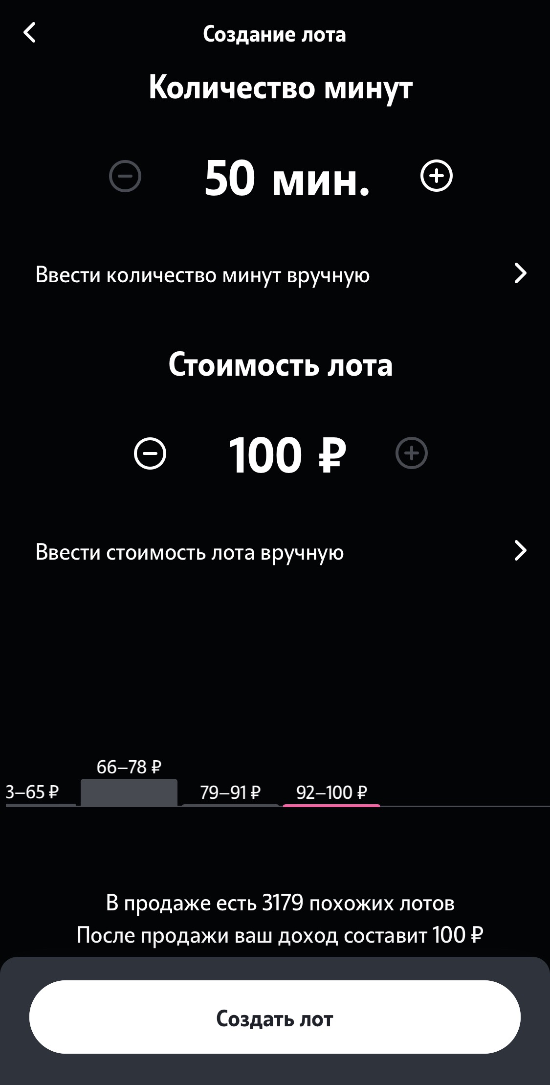 Допустим ваш тариф стоит 1000 рублей. Вам нужно выставить лот на 500 минут или 20 гигабайт.