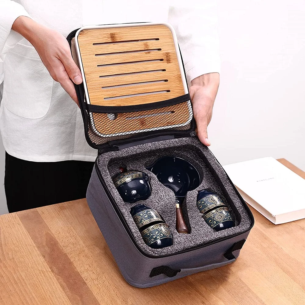 Porcelain Chinese Gongfu Tea Set,Portable Teapot Set with 360 Rotation Tea maker and Infuser Portable travel bag (Floral Blue) - Купить с бесплатной доставкой