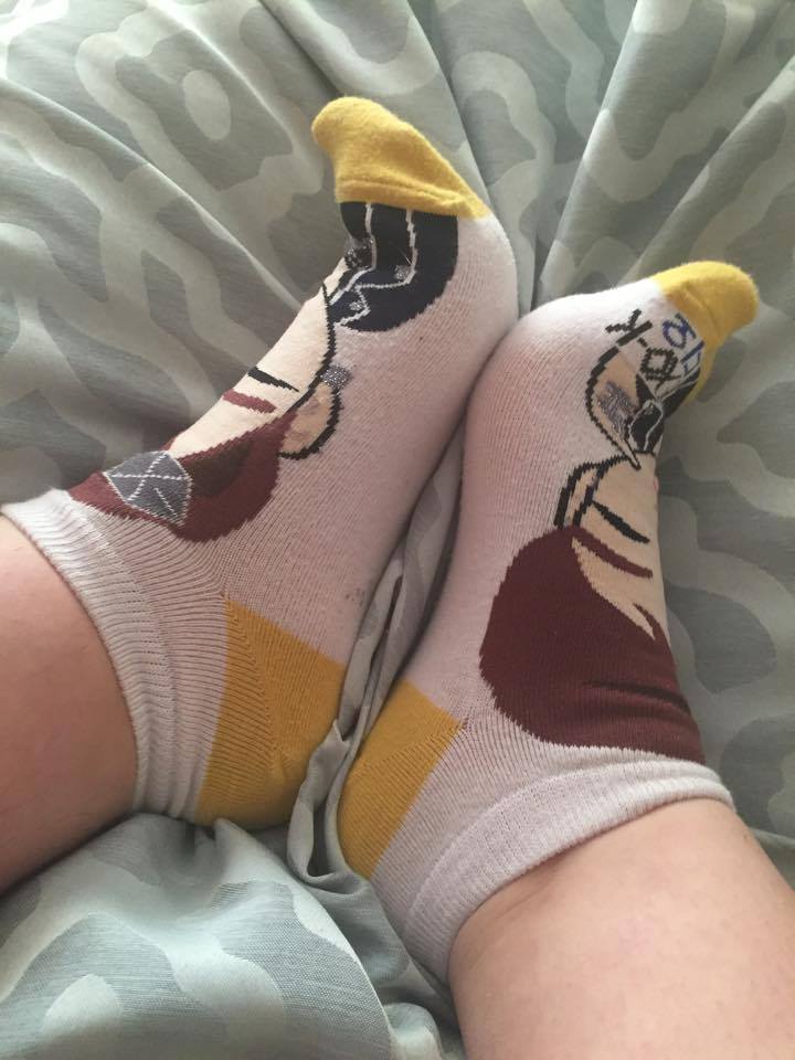 Natalia kicks off her black shoes and white ped socks.