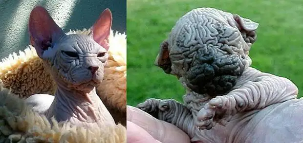 Гомозиготная Клеопатра рожала голых котят даже от обычных котов с шерстью . И . Сергеева, заводчица породы: «Это маленькие животные - до 4 кг, очень складчатые, с большими ушами, миндалевидными глазами, лапами средней длины .