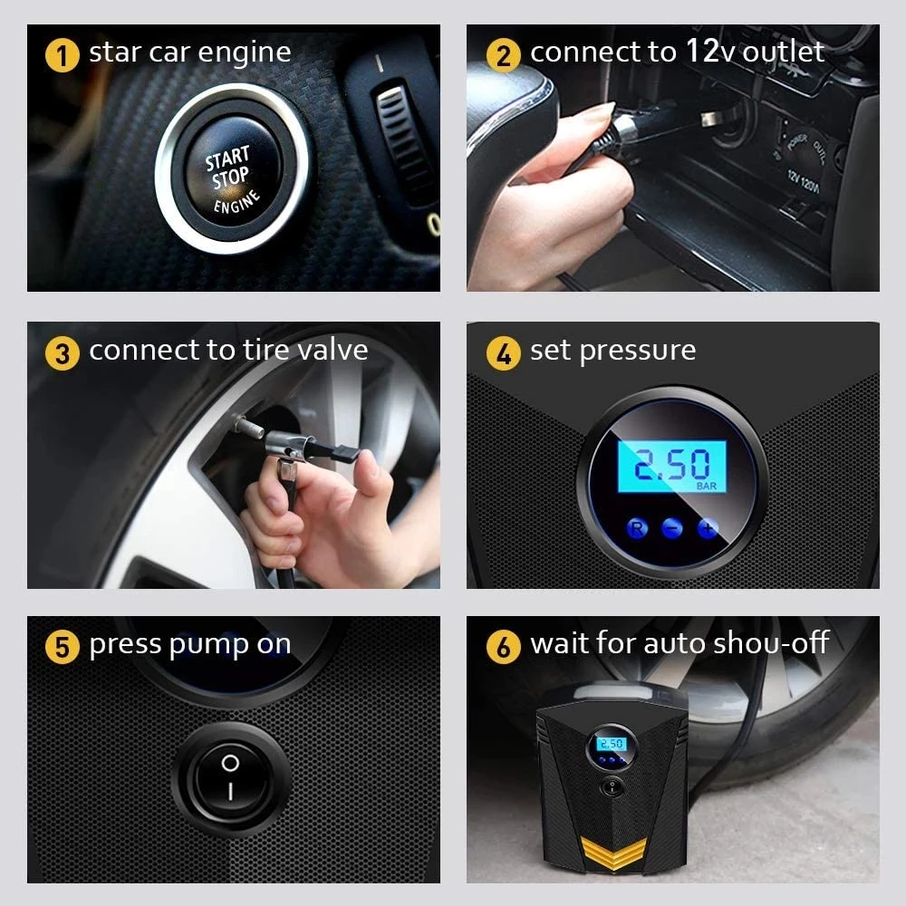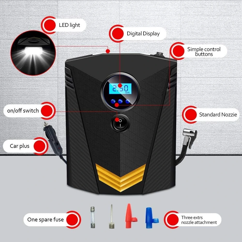 PIAZlrsyHere you can buy Portable Car Tyre Inflator LED Digital Lighting Tire Inflatable Pump DC 12V Air Compressor fo Cars Wheel Bicycle Tires with free delivery to your post office.