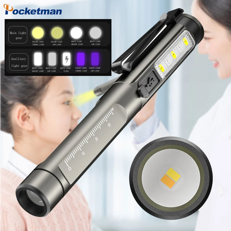 Portable White+Yellow LED Flashlight USB Rechargeable Penlight Hand Torch with Side COB Waterproof Medical Detection Clip Lamp - Купить с бесплатной доставкой