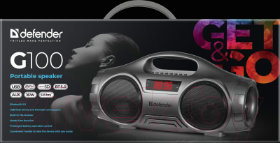 Defender G100 - недорогая портативная колонка с хорошим звуком и богатым функционалом . Все варианты подключения, которые которые может поддерживать беспроводная колонка , тут есть: Bluetooth , AUX, microSD, USB-flash и FM-радио .