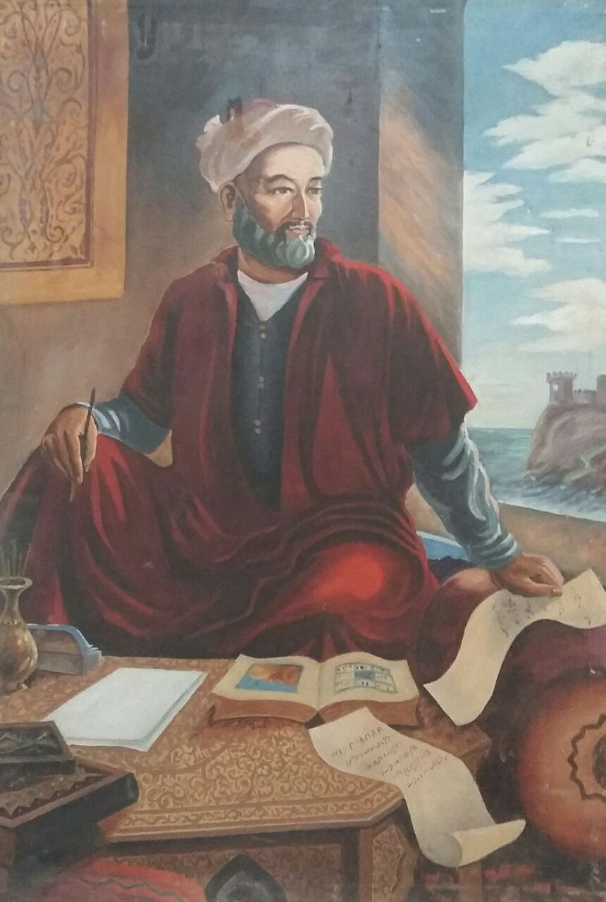 Описание: Картина написана в жанре портрета, в котором изображен образ великого восточного мыслителя, поэта, писателя и основателя узбекского языка, ученого XV в. Алишера Наваи.