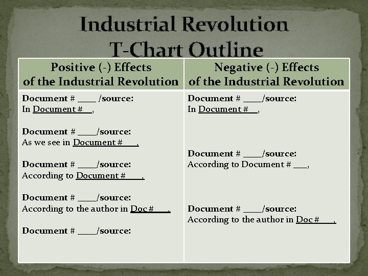 DBQ- Positive and Negative Effects of Industrial Revolution The Industrial Revolution began in England in the late 1700's . The Industrial Revolution was a time of new inventions, products, and methods of work . The results of the Industrial Revolution led to many short and long-term positive and negative effects .
