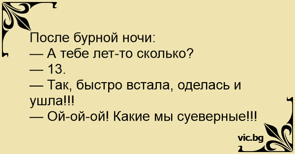 После бурной ночи: — А тебе лет-то сколько? — 13 . — Так, быстро встала, оделась и ушла!!! — Ой-ой-ой! Какие мы суеверные!!!