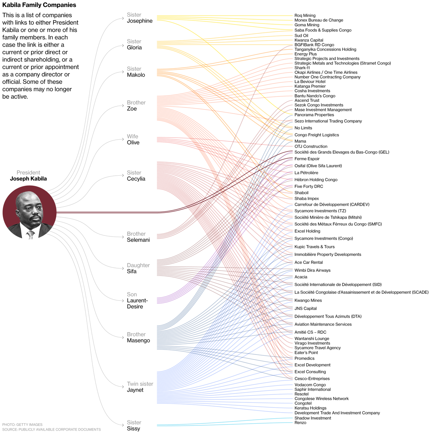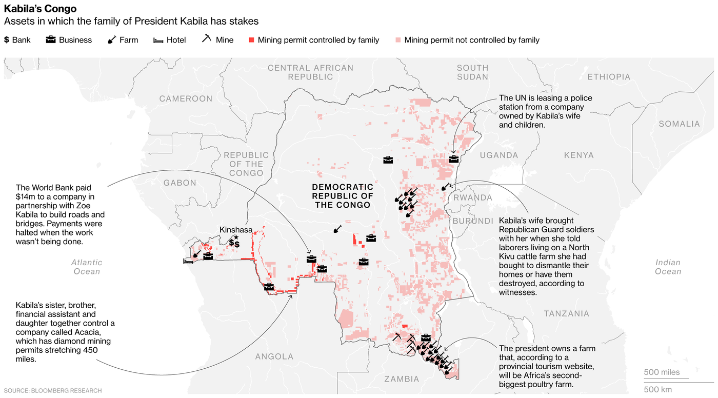 Хитросплетение всех опутавших Конго извилистых связей, активов и сделок, ведущих к клану Кабилы, ввергнет в депрессию даже опытного журналиста-расследователя. Исследование Нью-Йоркского университета установило, что семья Кабилы полностью или частично владела свыше 80 компаниями в Конго и за рубежом, при этом семья Кабилы пустила корни практически во все отрасли национальной экономики - в банки, авиаперевозки, строительство, транспорт, сельское хозяйство, телеком, добычу ископаемых, туристические агентства и ночные клубы.