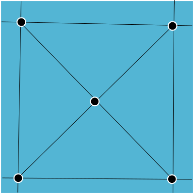Производится замер 9 точек, в результате замера получаются 4 квадрата, у которых известна высота углов относительно ноля. Далее по каждому квадрату строится билинейная поверхность:
