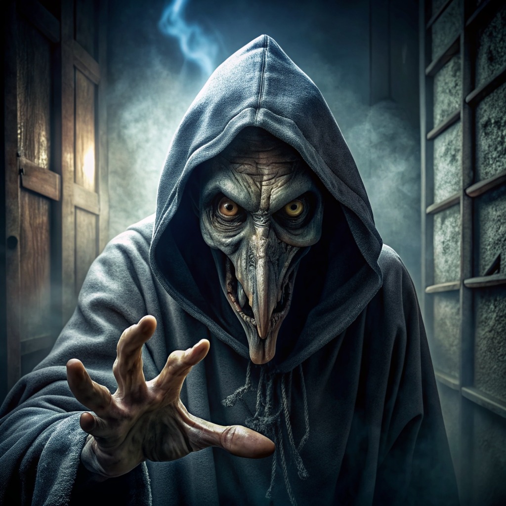 Проснувшись среди ночи, я почувствовала, что в комнате не одна. Я лежала на боку лицом к стене и убеждала себя, что мне это кажется. Чтоб развеять свои сомнения, я повернулась на другой бок и покрылась от страха липким потом: на меня смотрело странное существо с длинным носом, отдаленно напоминающее человека. На нем был темный плащ с капюшоном. Существо тянуло ко мне руку, с нее капала вода. В комнате было влажно и холодно.