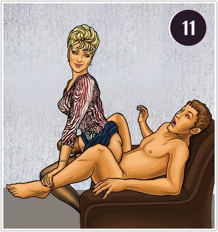 Мужчина усаживается на диван или кресло с ногами на полу. Девушка располагается на коленях мужчины, упираясь своими голенями и коленями в диван. Девушке удобно двигаться сверху вниз, подбирая нужный ритм и наклон вхождения члена. Это секс-поза хорошо подходит для поцелуев и объятий. В такой секс-позе девушка является госпожой и руководит процессом секса, а мужчина получает удовольствие. 2. Секс-поза сидя «наездница на диване»