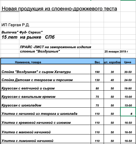 Прайс лист пекарни