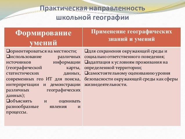 Практическая направленность - одно из приоритетных направлений современного географического образования, при котором становление ученика в школе должно происходить в качестве активного субъекта процесса познания .