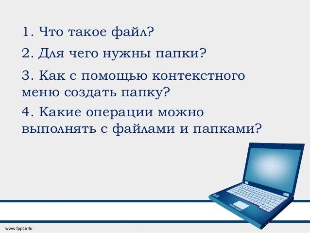 Переименование файлов и папок 1 . Правой кнопкой мыши щелкаете файл 2 . В контекстном меню выбираете Переименовать 3 . Дайте новое имя файла, нажимаете Enter Перемещение файлов и папок