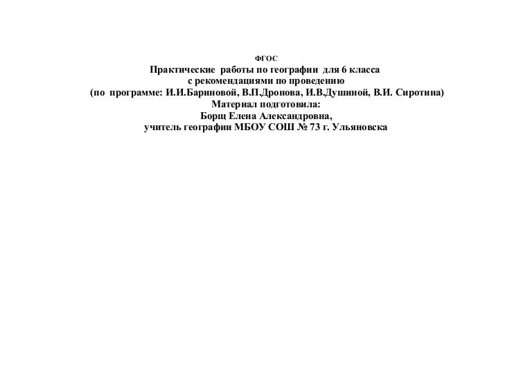 Практические работы по географии .6 класс . 1 . ФГОС Практические работы по географии для 6 класса с рекомендациями по проведению (по программе: И .И .Бариновой, В .П .Дронова, И .В .Душиной, В .И . Сиротина) Материал подготовила: Борщ Елена Александровна, учитель географии МБОУ СОШ № 73 . . .