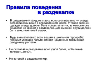 Правила поведения в раздевалке в школе следующие: Ученик обязан иметь в школе сменную обувь . Причем должен переобуваться сразу же, в раздевалке .