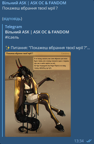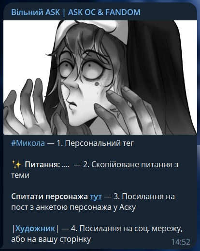 • Питання можна задати лише у коментарях під анкетою персонажа, яку ви маєте знайти в пошуку по теґу «#Анкета», або «#Анкета» «#Ім’я_персонажа». (Передивитись список персонажів та авторів можна у гугл таблиці - туть);