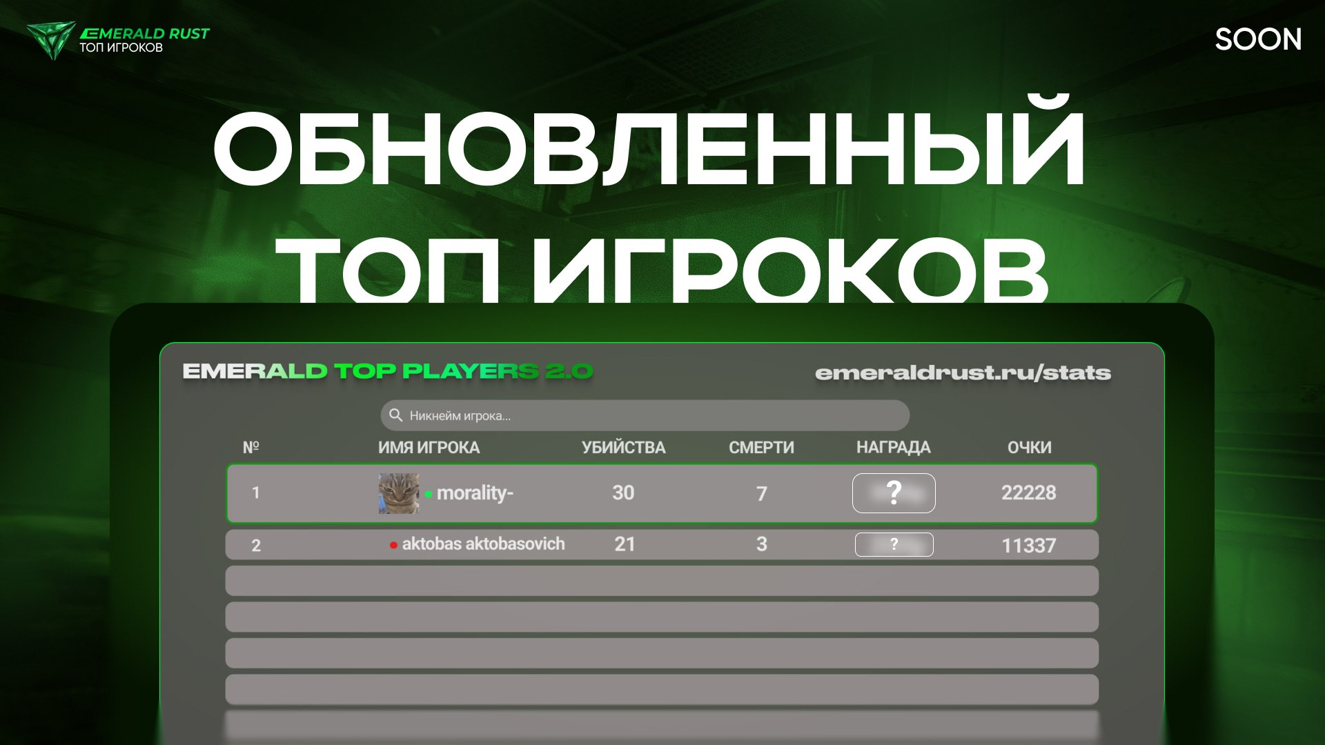 Игроки, занявшие первые пять мест в нашем обновленном топе игроков получают денежные призы с выплатой на банковскую карту/баланс во внутриигровой магазин emeraldrust.ru