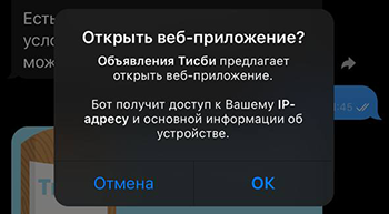 💡 Телеграм выведет уведомление о передаче Ваших данных об устройстве и IP адресе. Это не страшно, данные используются для улучшения сервиса.