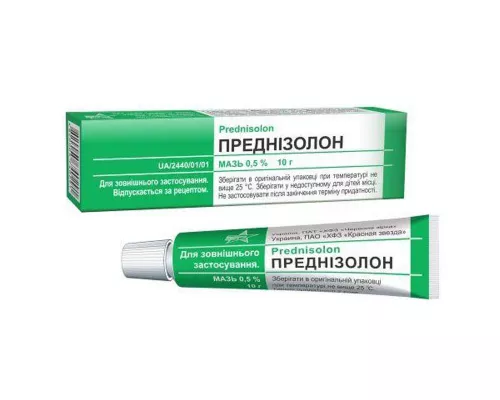 Инструкция для Преднизолон мазь 0 .5 % по 10 г в тубах Склад Фармакотерапевтична група Показання Взаємодія з іншими лікарськими засобами та інші види взаємодії Застосування у період вагітності або годування груддю Спосіб застосування та дози Побічні ефекти Умови зберігання Категорія відпуску Адреса Лікарська форма Фармакологічні властивості