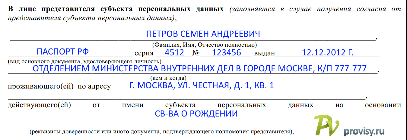 Представитель субъекта персональных данных образец