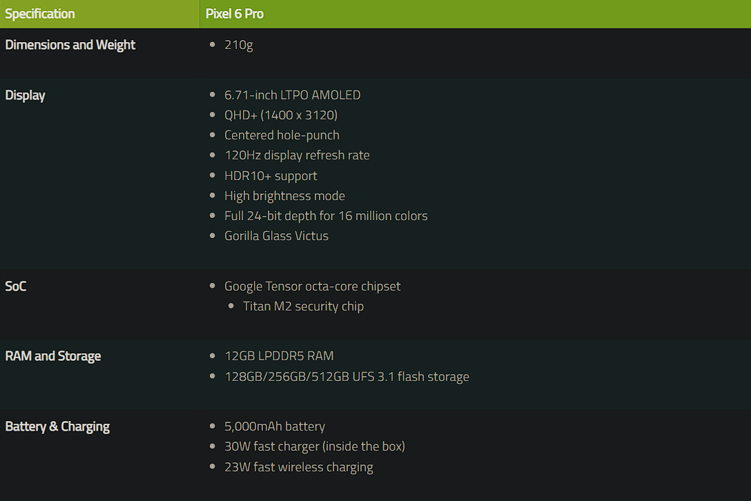 Pixel 6 Pro оснащен большим 6,71-дюймовым LTPO AMOLED-дисплеем с разрешением QHD+ (1400 x 3120) и частотой обновления 120 Гц. Передняя и задняя панели защищены стеклом Gorilla Glass Victus. Телефон работает на собственном восьми-ядерном чипсете Tensor от Google, в паре с 12 ГБ оперативной памяти и флеш-накопителем UFS 3.1 емкостью до 512 ГБ.