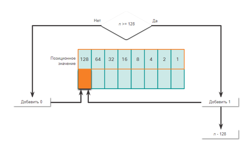 - Если да, то пишем 1 в позиционное значение 128 и вычитаем 128 от десятичного числа.