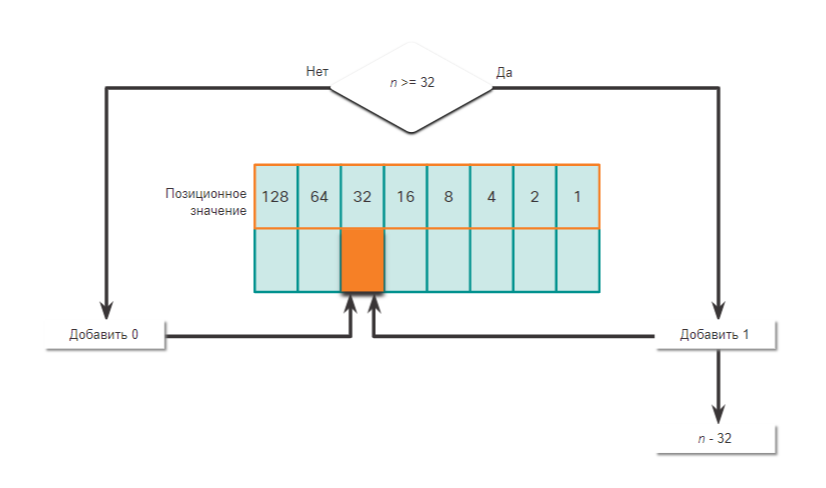 - Если да, то пишем 1 в позиционное значение 32 и вычитаем 32 от десятичного числа.
