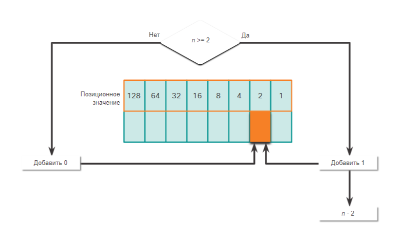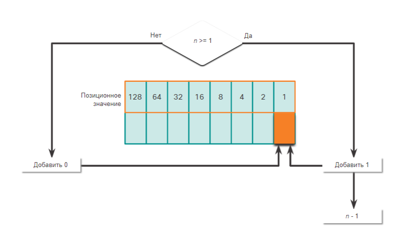 - Если нет, тогда пишем 0 в позиционное значение 1 позиционное значение.