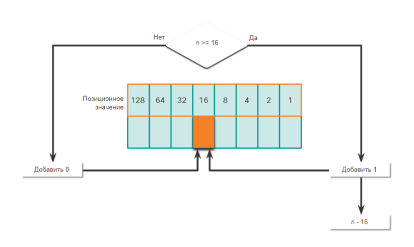 - Если да, то пишем 1 в позиционное значение 16 и вычитаем 16 от десятичного числа.