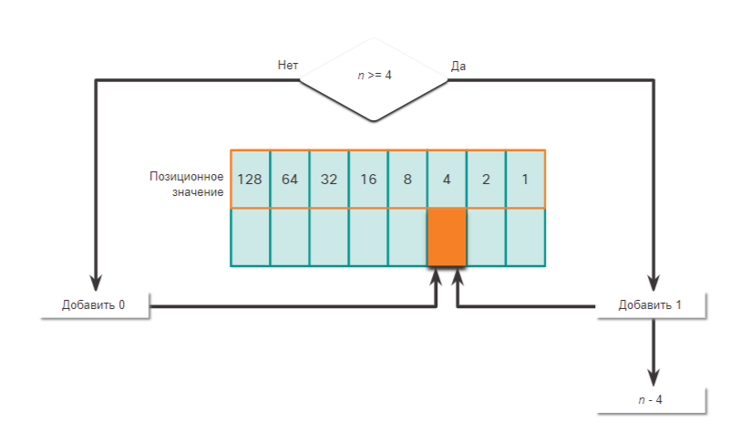 - Если да, то пишем 1 в позиционное значение 4 и вычитаем 4 от десятичного числа.