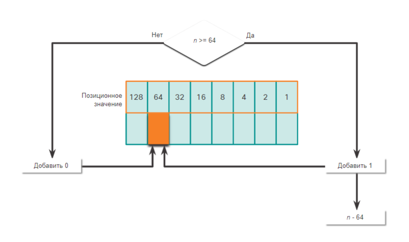 - Если да, то пишем 1 в позиционное значение 64 и вычитаем 64 от десятичного числа.