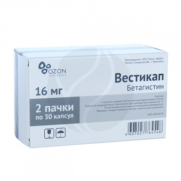 Вестикап - описание препарата, инструкция по применению, отзывы . Написать отзыв . Отзывов: 0 . Производители: Озон (Росия) Действующие вещества . Бетагистин . Класс заболеваний . Синдром вертебробазилярной артериальной системы .