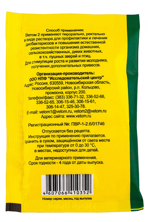 ВЕТОМ 2 Порошок для орального применения рег . 35-3-5 .12-0602№ПВР-1-2 .6/01746 от 26 .03 .12 - Бессрочно Форма выпуска, состав и упаковка Порошок для орального применения белого цвета, мелкодисперсный, без запаха, растворимый в воде, с образованием осадка белого цвета . Вспомогательные вещества: сахарная пудра - 950 мг, крахмал - 40 мг .