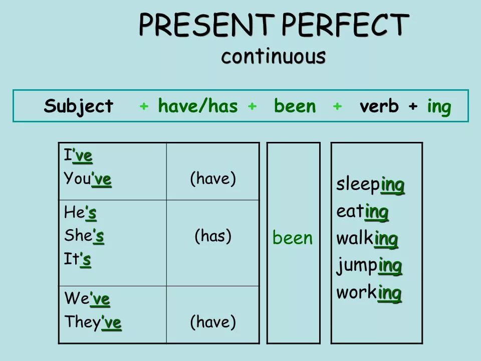 Давайте ещё раз изучим настоящее совершенное длительное время. Рассмотрим, как оно образуется, в каких случаях употребляется и когда его можно заменить временем Present Perfect. Начнем со схемы образования Present Perfect Continuous.