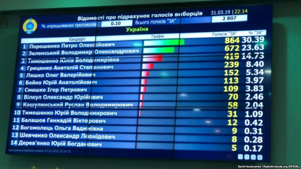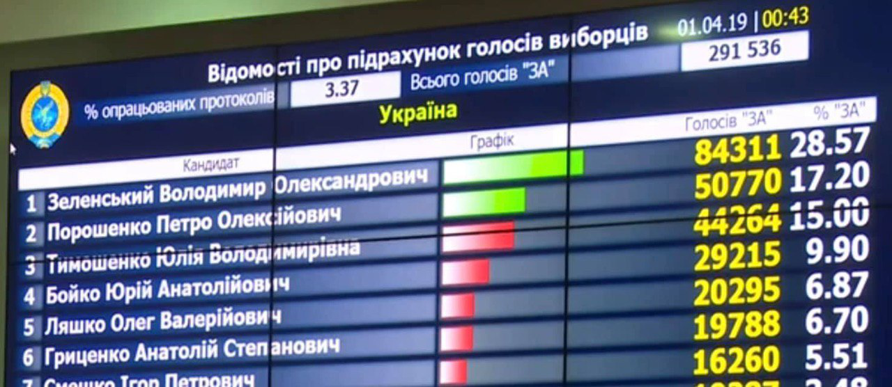 «Артист Володимир Зеленський лідирує в першому турі голосування на виборах президента України з 28,6%, чинний глава держави Петро Порошенко набирає 17,2%, а лідер «Батьківщини» Юлія Тимошенко — 15,0%», — свідчать дані Національного екзит-полу станом на 20:00.