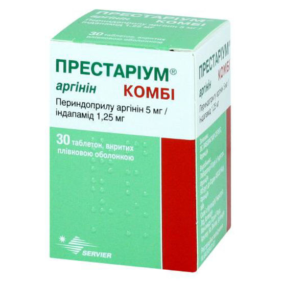 Престариум® COMBI аргинин (Prestarium Combi Arginine) Действующие вещества Comb .drug (perindopril arginine, indapamide) Фармакотерапевтическая группа Антигипертензивные средства ., Антигипертензивные средства . Лекарственная форма Таблетки, покрытые плёночной оболочкой 5 мг/ 1,25 мг N30 (тубы) Состав - Действующие вещества