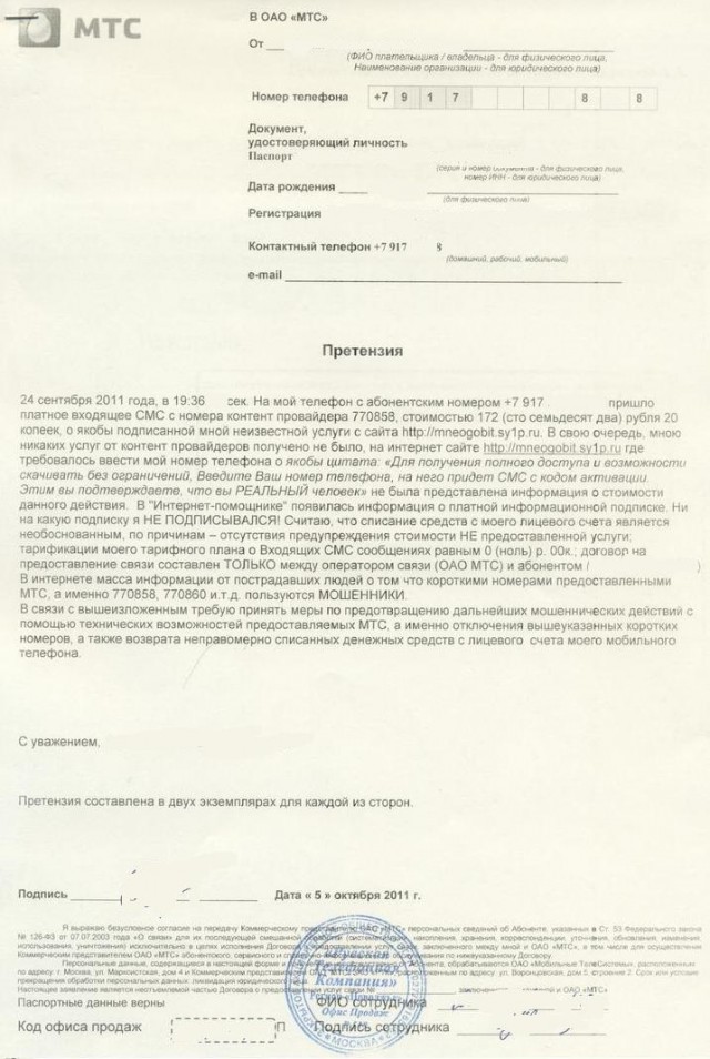 Претензия Магазину Мтс