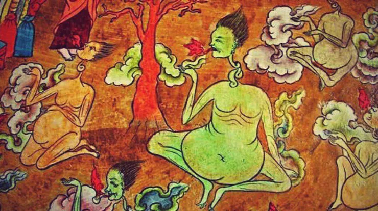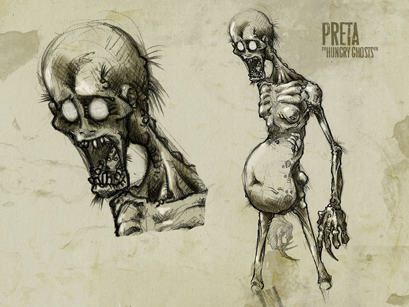 Люди, которые при жизни отказывали в милостыне, были алчны в еде и питье, отличались сребролюбием и себялюбием, жили в плену своих желаний и обстоятельств, не оказывая должной заботы о душе. В притолоке духам необходимо исправить испорченную карму и муки неутолимой жажды и голода длятся до тех пор, пока кармические впечатления в сознании духа не исчерпают себя. Лишь затем они перерождаются в лучших сегментах Колеса Жизни(Сансары).