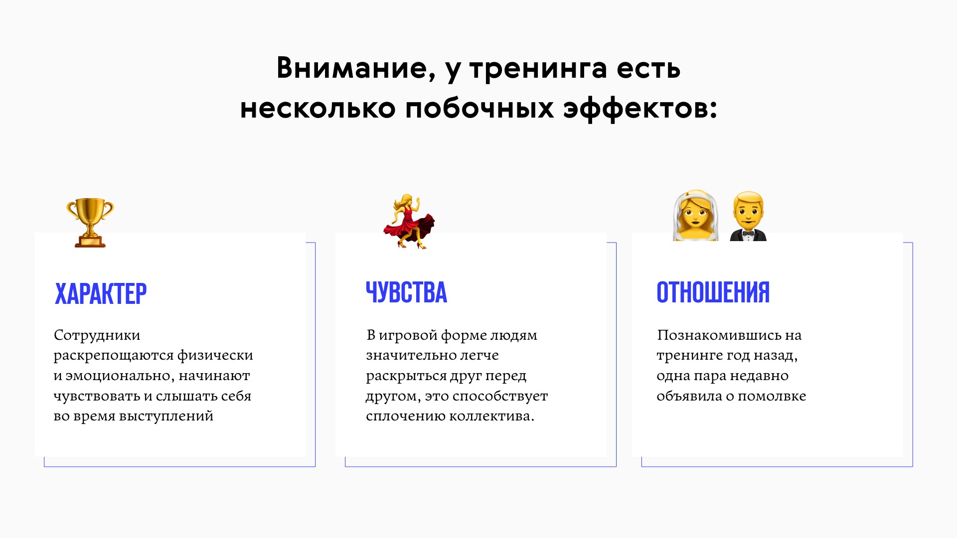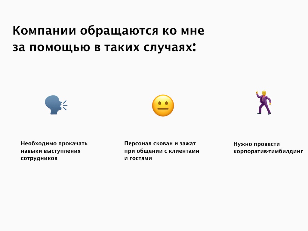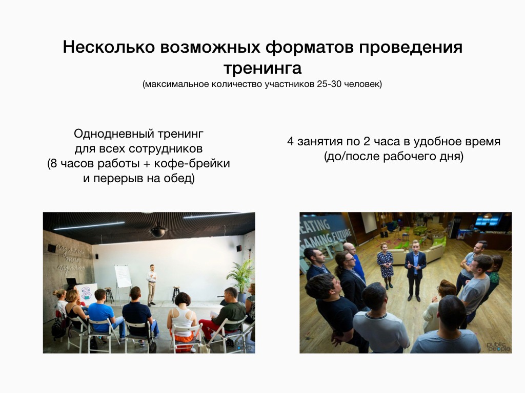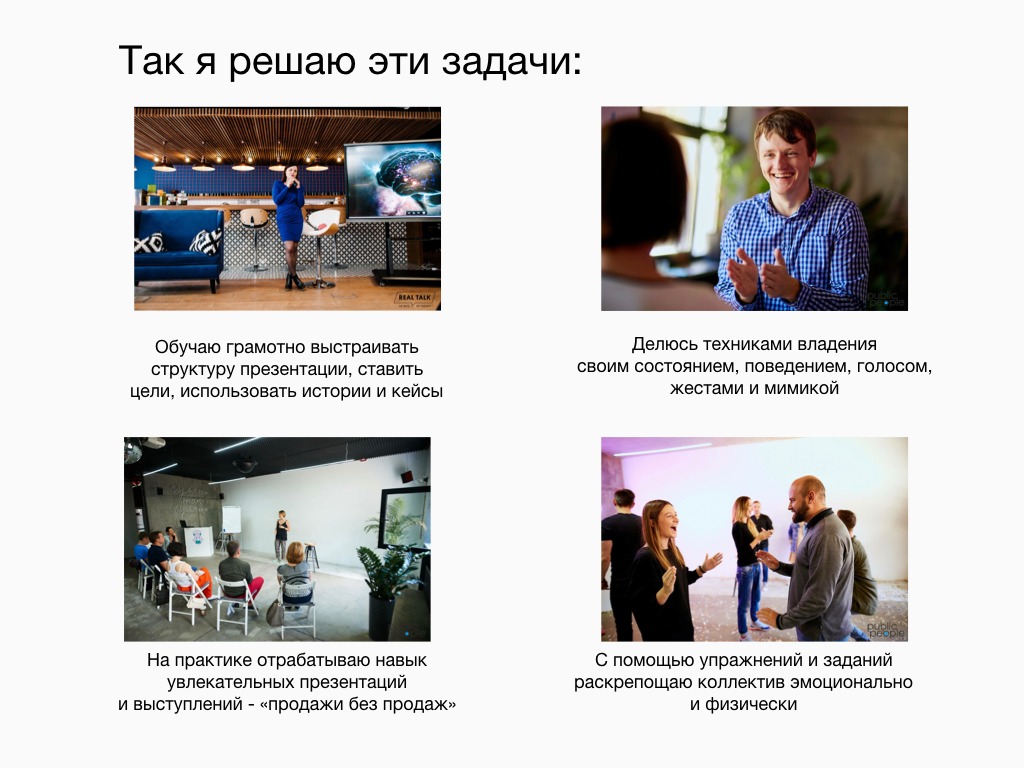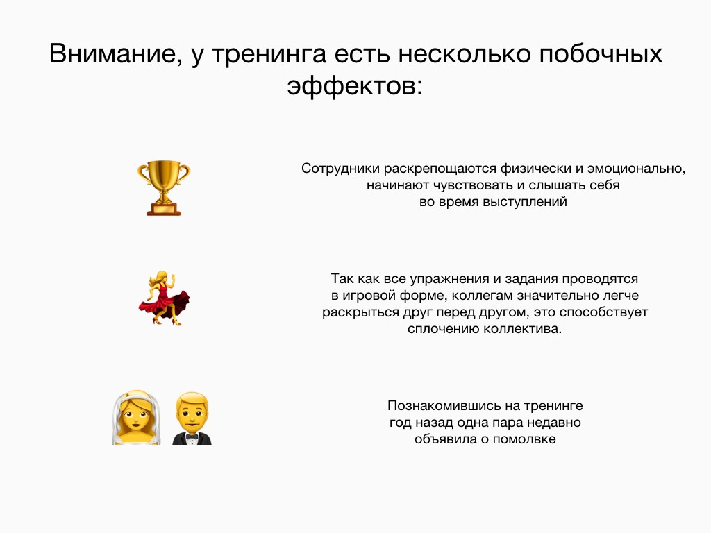 - Добавил эмоции. После первых важных слайдов о сути услуги, на мой взгляд, обязательно должна быть вишня на торт. Вообще, услуга Ромы — это весело: люди собираются на несколько часов, играют разные сценки, узнают друг друга и всячески резвятся. Об этом очень важно сказать.