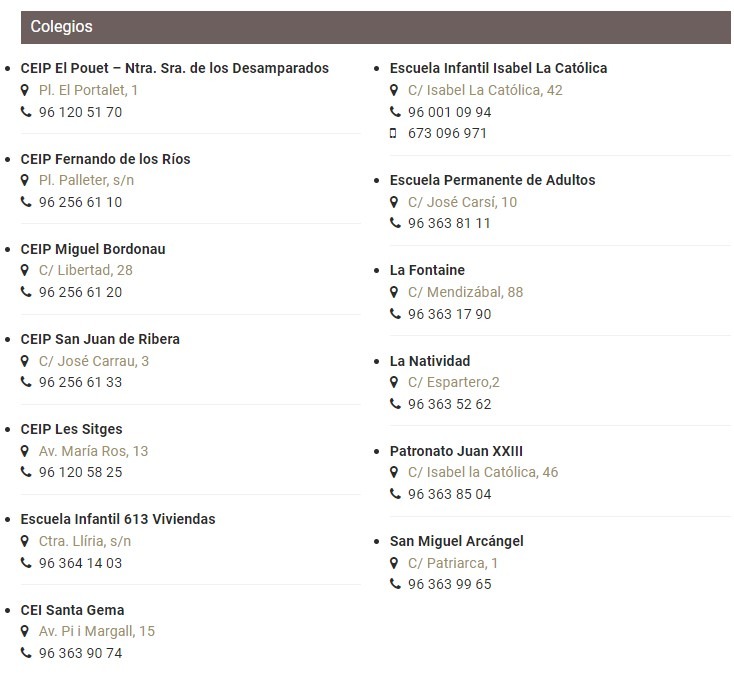 В Бурхасоте имеется 5 государственных школ и 4 частных, а также католическая и школа для взрослых. Поскольку в Испании словом "collegio" называются также детские сады, не могу сказать какие из них для какого возраста предназначены. Вот здесь можно посмотреть подробнее, если есть желание.
