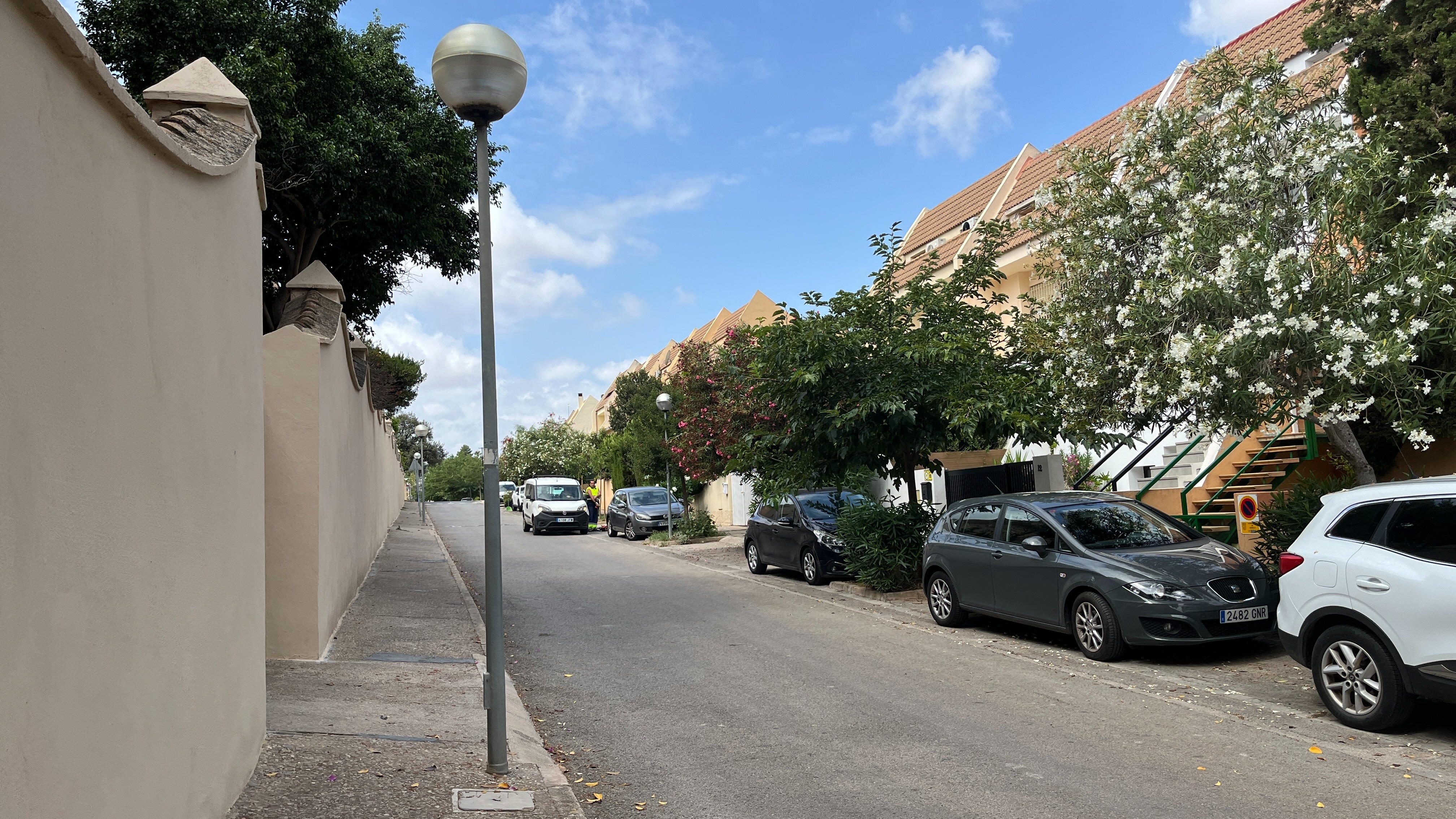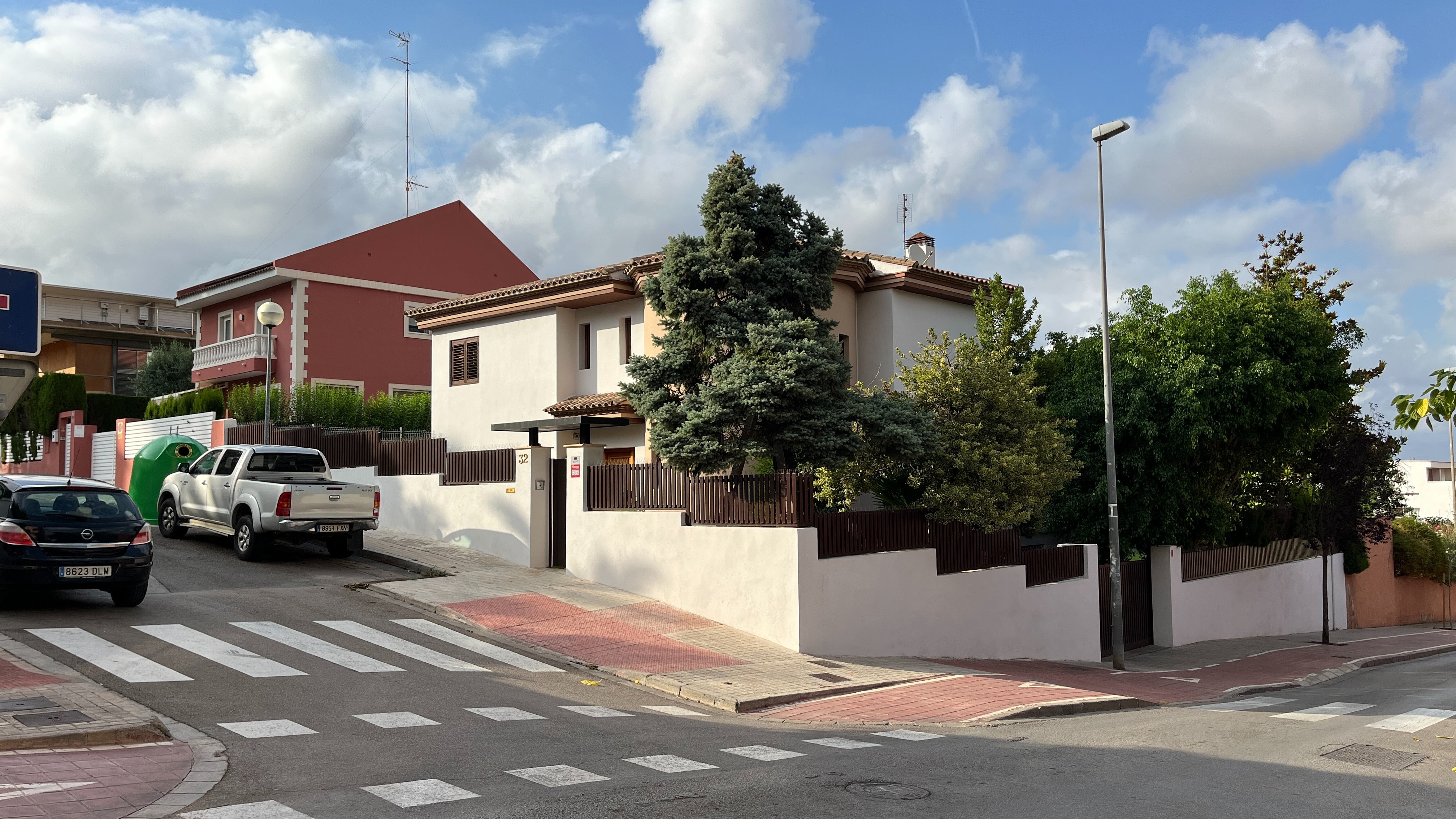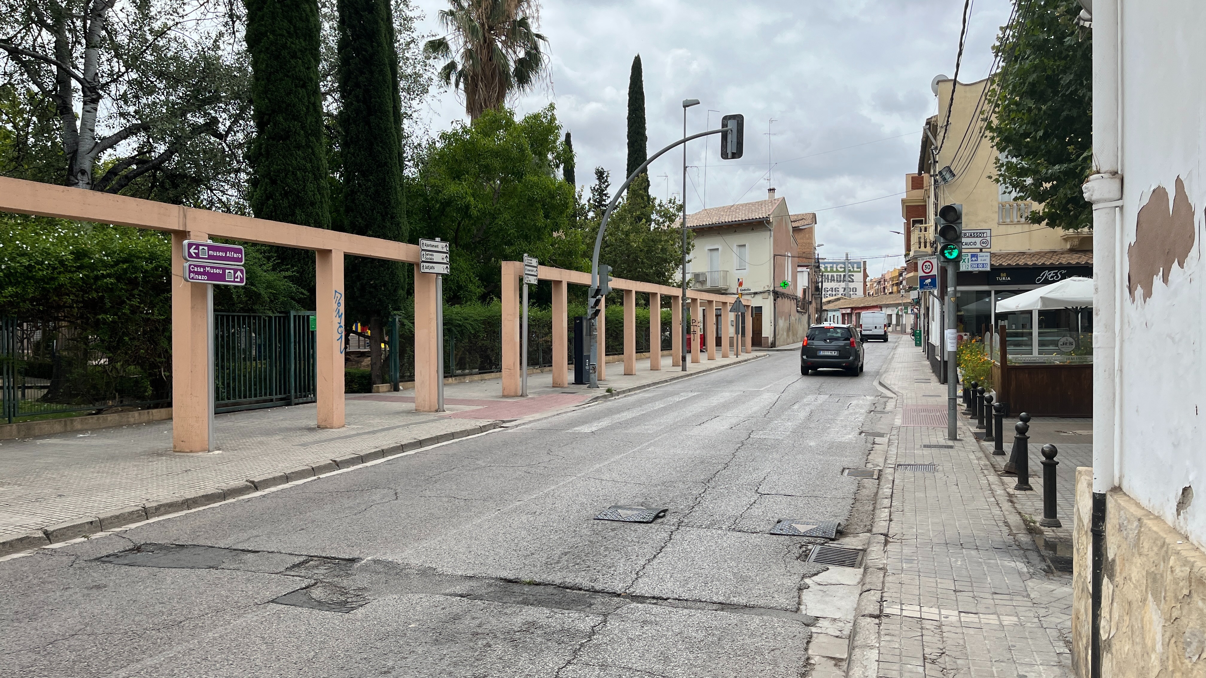 Главная улица Годельи (Calle Major) идет через весь городок и она автомобильная. Ходить там пешком не очень приятно. Вот так она выглядит около станции: узкий тротуар, полустертый пешеходный переход со светофором, никакого сужения проезжей части в районе перехода.