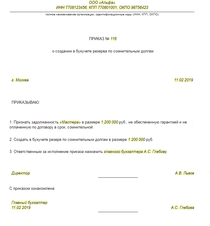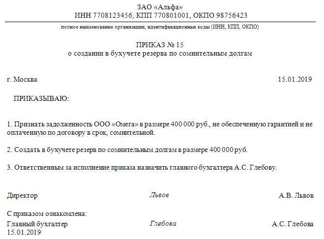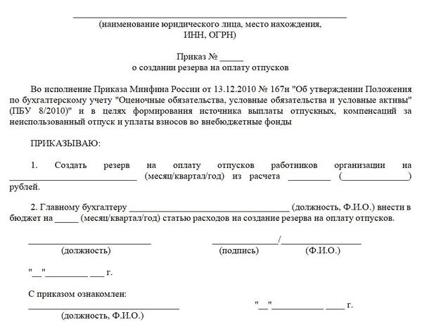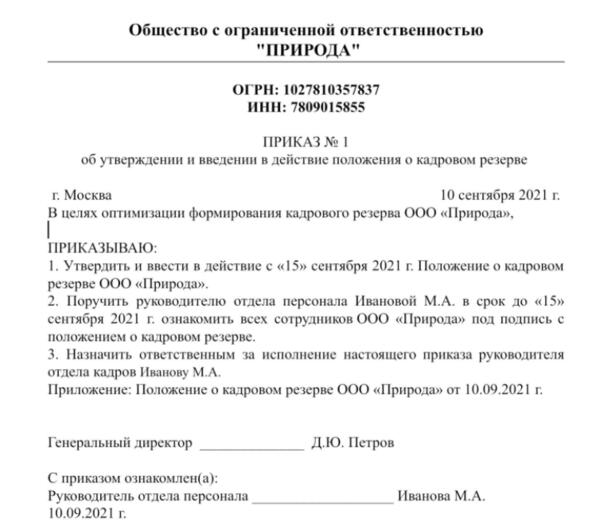 Приказ о создании резерва