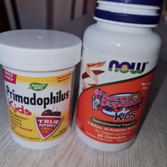 Примадофилус детский - для детей от 2 до 12 лет (есть в порошке для детей с рождения), жевательно-сосательные таблетки с вишнёвым вкусом . В одной таблетке 3 млрд бактерий: Lactobacillus rhamnosus Bifidobacterium longum Lactobacillus acidophilus Стоимость со скидкой 15% - 470 рублей, в баночке 30 таблеток .
