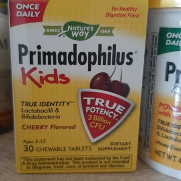 Примадофилус Кидс e естествен пробиотик за деца срещу проблеми с храносмилането . Пробиотична смес e предназначена за деца от 2 до 12 години, под формата на дъвчащи таблетки сприятен вкус на череша .
