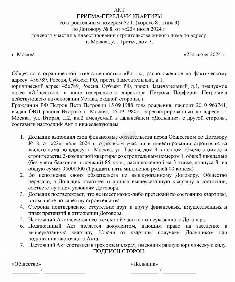Пример акта передачи квартиры
