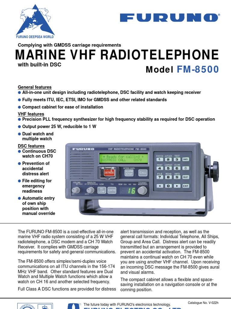 Морская УКВ - радиостанция fm-8500 ( furuno , Япония) со встроенным приемником ЦИВ класса А . 54 международных УКВ каналов, погодные, 55 программируемых каналов .